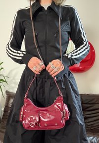 • Petit sac à main en cuir verni rouge avec plusieurs poches zippées et ferrures argentées, suspendu par une sangle marron, tenu par une personne vêtue de noir.
