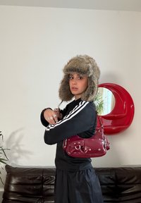 • Sac à main en cuir verni rouge avec ferrures argentées, doté de fermetures éclair et d'un détail anneau rond. Le mannequin porte un chapeau doublé de fourrure et un survêtement noir.