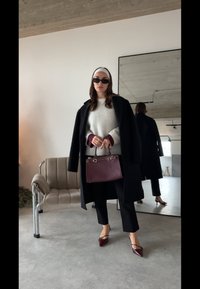 • Femme en pantalon noir, talons bordeaux, pull blanc, manteau noir posé sur les épaules, lunettes de soleil et serre-tête, tenant un sac à main bordeaux à l'intérieur.