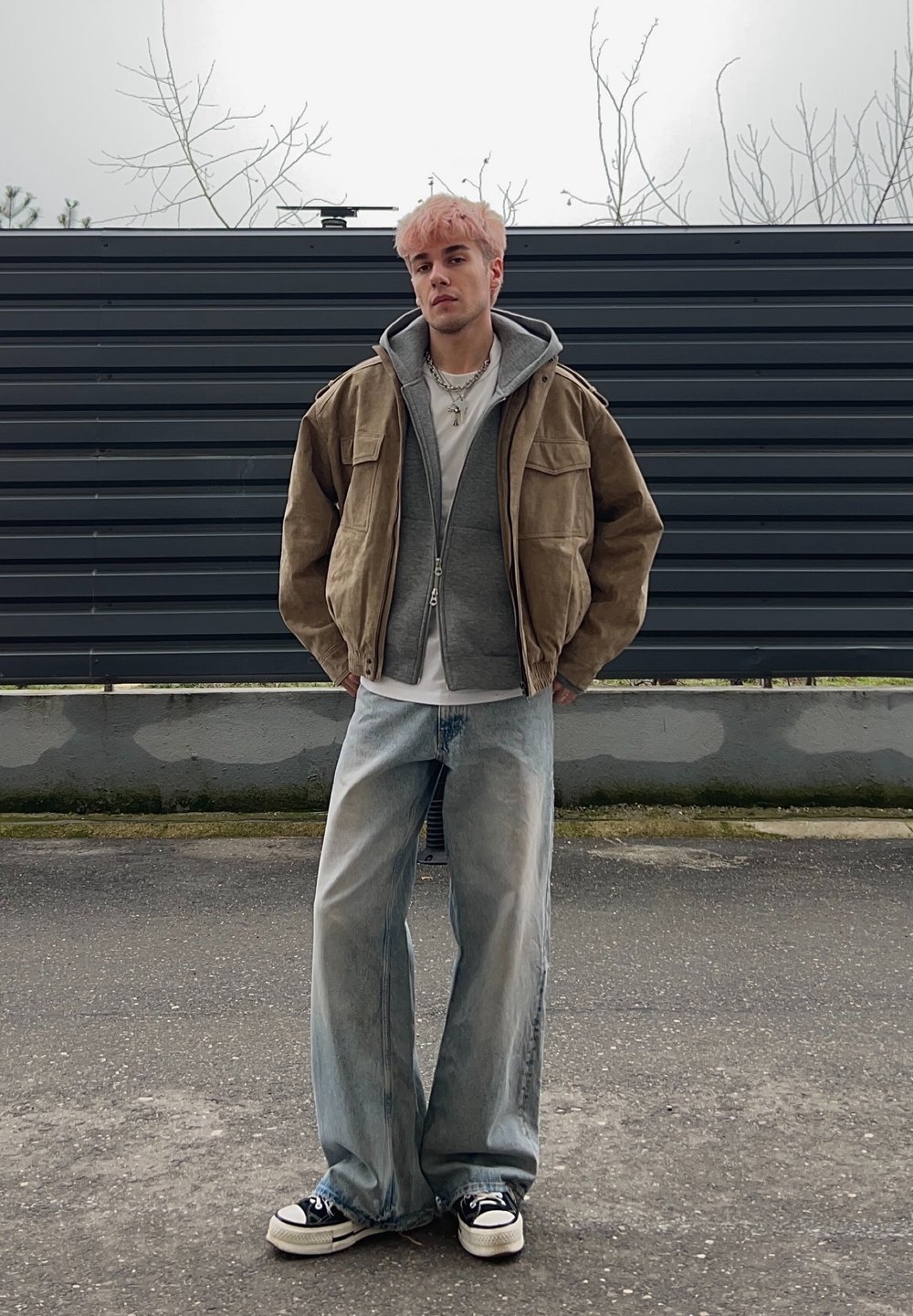 • Jeune personne aux cheveux roses portant une veste marron superposée, un sweat à capuche gris, une chemise blanche et un large jean bleu clair, debout à l'extérieur contre une clôture noire.