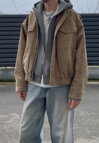 • Homme portant une veste en suède beige superposée sur un sweat à capuche gris zippé, une chemise blanche, un jean bleu clair et des colliers en chaîne argentés, debout à l'extérieur.