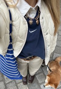 • Personne portant une veste matelassée crème, un sweat Nike bleu, une chemise blanche, un pantalon beige, une ceinture léopard, tenant un sac rayé bleu ; un chien marron en laisse à proximité.