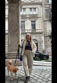 • Jeune femme en veste crème et pantalon beige promenant un chien dans une rue de la ville avec des bâtiments historiques et des voitures en arrière-plan.