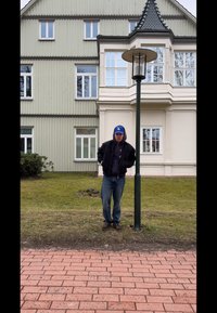 • Homme portant une casquette bleue et une veste noire appuyé contre un lampadaire dans une zone herbeuse devant un bâtiment de couleur pâle avec des fenêtres à cadres blancs.