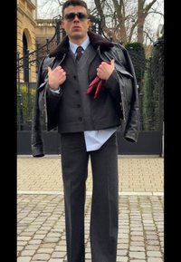 • Personne portant un pantalon large à rayures fines, superposant des chemises foncées et claires, veste en cuir posée sur les épaules, tenant des gants en cuir rouge.