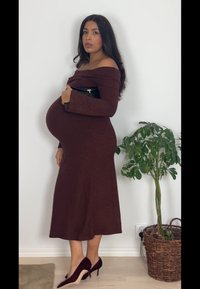 • Femme enceinte en robe marron et manteau foncé, tenant des gants bordeaux et un sac à main noir, debout à l'intérieur à côté d'une plante en pot.