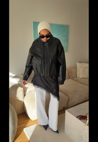 • Veste en cuir noire courte avec poignets élastiques, portée sur un haut en satin noir bordé de dentelle, associée à un pantalon blanc à jambes larges et des lunettes de soleil.