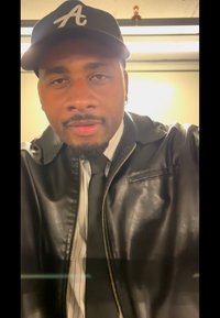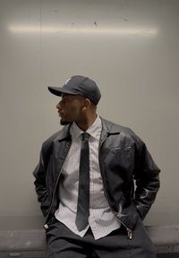 • Homme portant une casquette noire, une veste en cuir, une chemise rayée et une cravate noire, assis contre un mur gris clair uni, regardant vers sa gauche.