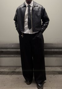 • Homme portant une veste en cuir noire, une chemise blanche rayée avec une cravate noire, un pantalon large noir et des chaussures noires, debout les mains dans les poches.