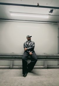 • Homme en veste en cuir noire et casquette assis sur un banc en métal dans un espace intérieur minimaliste, regardant vers sa droite.
