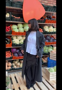 • Manteau noir sur un haut péplum blanc, assorti à une jupe noire. Cadre intérieur avec une lumière décorative et un mur carrelé visible.