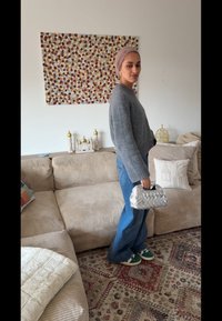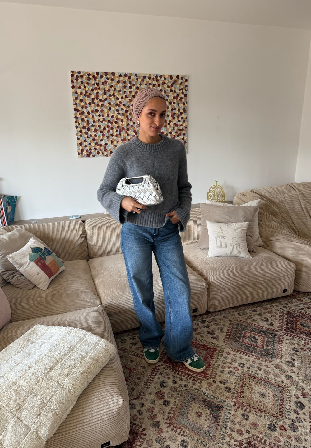 • Femme portant un foulard beige, un pull gris, un jean bleu et des baskets vertes, debout dans un salon tenant un sac à main blanc en tissu tissé.