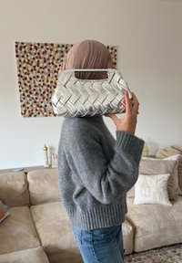 • Femme portant un pull gris et un turban beige tenant une pochette tissée argentée dans un salon avec une œuvre murale à motifs et un canapé beige.