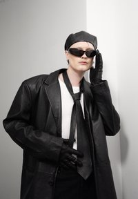 Personne portant un manteau en cuir noir surdimensionné, un foulard noir, des lunettes de soleil, un pantalon noir à jambes larges, debout dans un coin blanc à l'intérieur.