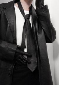 • Personne portant une veste en cuir noire, des gants noirs, une cravate en cuir noire sur une chemise blanche, ajustant le nœud de la cravate d'une main.
