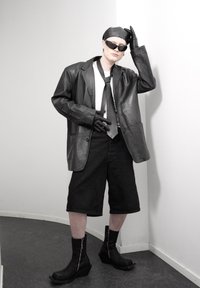 • Personne portant une veste en cuir noire, des gants, une casquette, des lunettes de soleil, une cravate, un short ample arrivant aux genoux et des bottes noires, debout dans un coin contre des murs blancs.