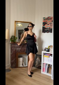 Femme en robe noire et lunettes de soleil se tient dans une pièce avec un miroir, une étagère à livres, un appareil photo vintage et une affiche colorée sur le mur.