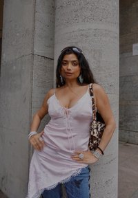 • Femme aux longs cheveux noirs portant une robe nuisette rose clair et un jean bleu, debout contre une grande colonne en pierre, portant un sac à bandoulière à motif.