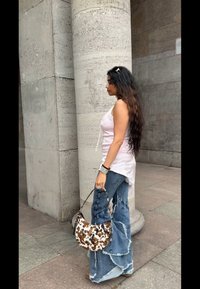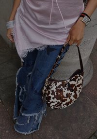 • Femme portant un jean en patchwork effiloché et un haut rose bordé de dentelle, tenant un sac à bandoulière imprimé vache marron et blanc.