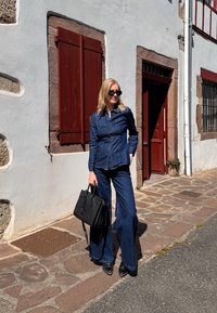 • Femme portant une veste en jean et un pantalon, lunettes de soleil, tenant un sac à main noir, debout devant un bâtiment blanc avec une porte rouge et un pavé de pierre.