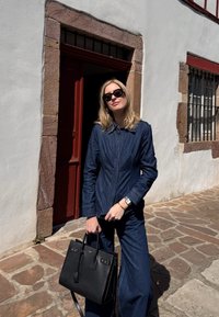 • Femme portant une tenue en denim foncé et des lunettes de soleil, se tenant dans une rue pavée à côté d'un bâtiment blanc avec des volets et une porte rouges, tenant un sac à main noir.