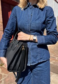 • Femme portant une veste en jean et un pantalon tenant un sac à main en cuir noir à l'extérieur au soleil, montrant une montre-bracelet et un bracelet.