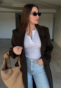 • Femme portant des lunettes de soleil noires, un manteau marron foncé, un haut blanc, un jean bleu clair et des chaussures noires, tenant un grand sac tissé beige à l'intérieur.
