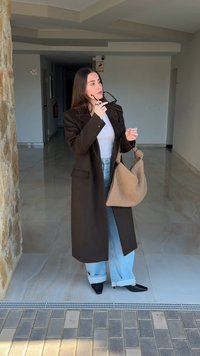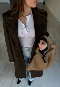 • Femme portant un manteau marron foncé, un haut henley blanc côtelé, un jean bleu clair, tenant un grand sac tissé beige à l'intérieur sur un sol carrelé.