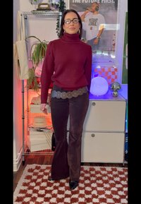 • Femme portant un pull à col roulé bordeaux, un pantalon brun foncé, une ceinture ronde cloutée et des lunettes, debout à l'intérieur sur un tapis à motifs.