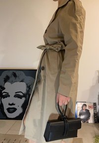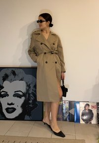 • Personne portant un trench-coat beige noué à la taille, tenant un sac à main noir ; vue partielle d'une œuvre de Marilyn Monroe en arrière-plan.