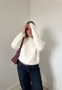 • Femme en pull blanc pelucheux et jean foncé, tenant sa tête avec une main, portant un sac à bandoulière tissé foncé, debout contre un mur uni.