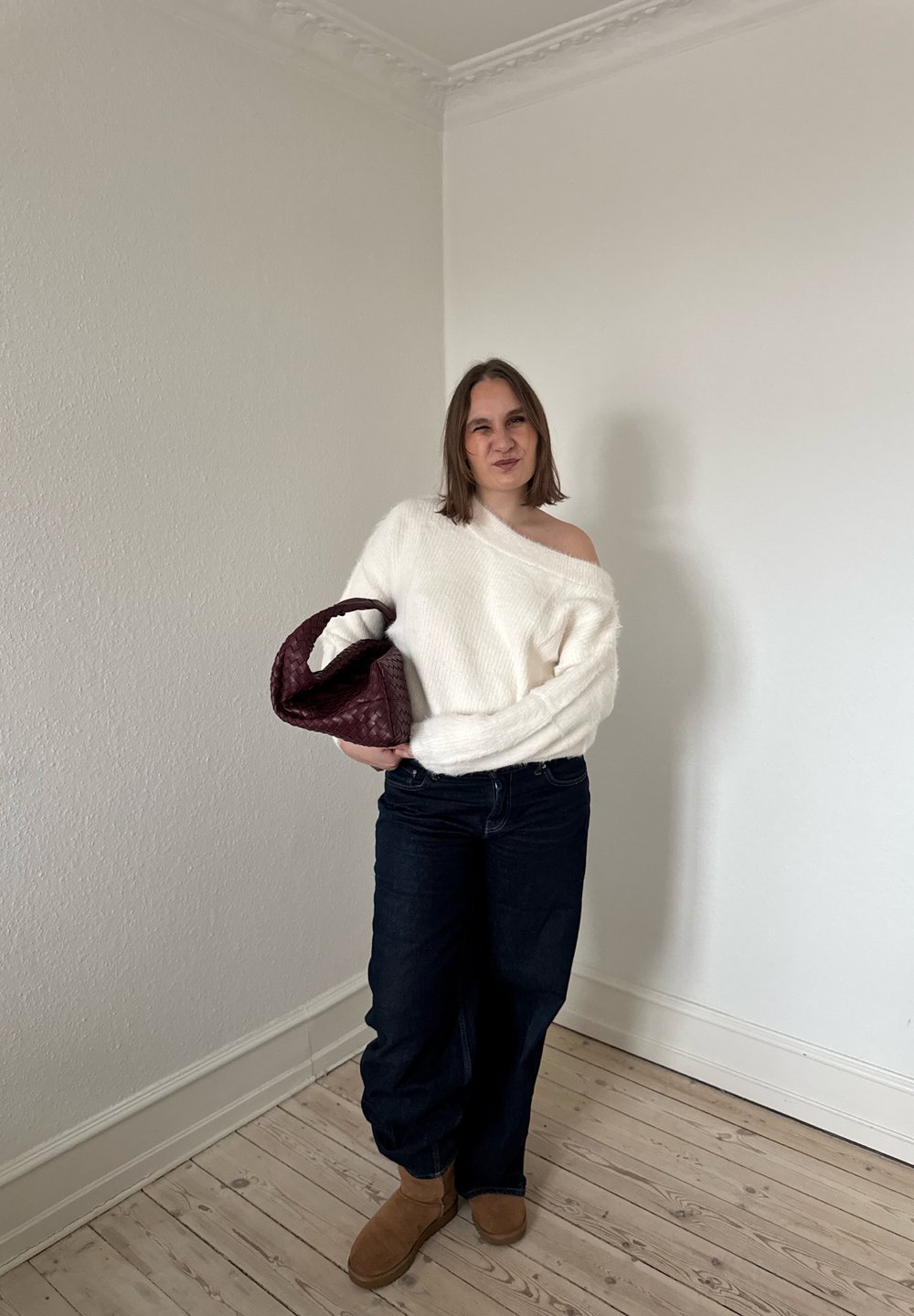 • Femme portant un pull blanc à épaules dénudées, un jean foncé et des bottes marron, tenant un grand sac à main tressé rouge foncé dans une pièce vide.