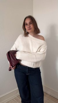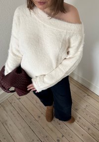 • Femme portant un pull blanc duveteux à épaules dénudées, un pantalon large foncé et des bottes marron clair, tenant un sac à main tissé marron foncé à l'intérieur sur un sol en bois.