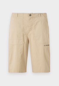 Cardigan bleu marine avec accents et boutons blancs, t-shirt blanc, short cargo beige, sac fourre-tout noir, chaussures à enfiler à motif écossais, lunettes de soleil rouges.