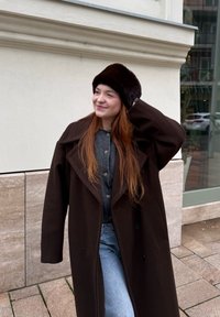 • Jeune femme aux longs cheveux roux, portant un manteau marron foncé et un chapeau en fourrure assorti, debout à l'extérieur près d'un mur beige et d'une fenêtre en verre.