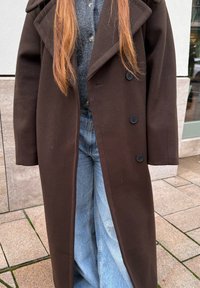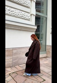 • Manteau en laine marron avec un large col, des boutons croisés et des manches longues, associé à un jean à jambes larges bleu clair.