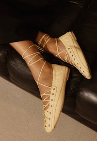 Jeune femme appuyée sur le coin d'un bâtiment en pierre, portant un chapeau en fausse fourrure crème, un long manteau blanc, des collants en dentelle, un short, et tenant un sac blanc froncé.