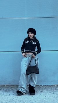 • Pull noir court avec accents blancs, pantalon de survêtement gris oversize, chapeau en fourrure et petit sac à main noir. Ceinture perlée ajoutant du détail.