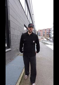 Veste zippée noire avec capuche et logo, associée à un pantalon cargo noir amplement coupé. Baskets blanches. En arrière-plan, des murs en briques rouges et des fenêtres.