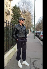 • Homme portant une veste en cuir noire, un pantalon de survêtement foncé, des baskets blanches, une casquette et des lunettes de soleil, marchant sur un trottoir en ville à côté d'une clôture en métal.