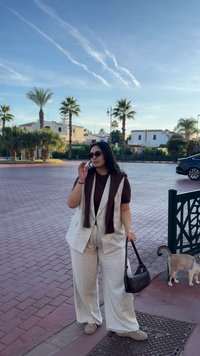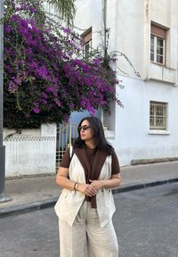 • Femme aux cheveux foncés portant des lunettes de soleil, un pull brun, un gilet beige clair et un pantalon beige clair, debout dans la rue près d'un bâtiment blanc avec des fleurs violettes.