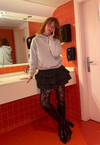 • Jeune personne aux cheveux roux appuyée sur un lavabo dans des toilettes aux carreaux rouges, portant un sweat à capuche gris, une jupe à carreaux noire, des collants en dentelle et des bottes noires.
