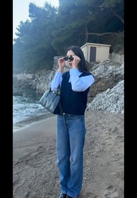 • Personne portant une chemise bleue et un gilet en laine bleu marine tenant un sac à main en cuir noir, debout sur une plage de sable près de l'eau.