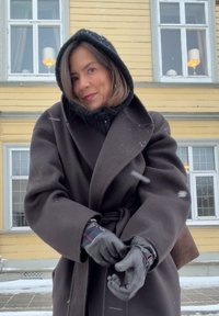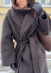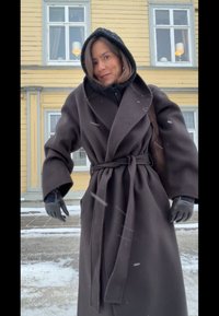 • Femme en manteau marron foncé ceinturé et gants en cuir noirs, debout à l'extérieur près d'un bâtiment jaune avec de la neige au sol.