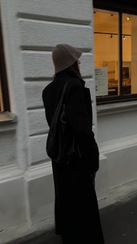 • Manteau noir sur un haut gris, pantalon gris large et bonnet marron. Porté avec des chaussures noires pointues, debout près d'une porte en verre.