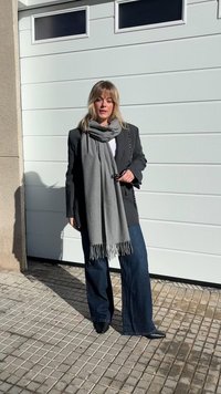 • Femme debout près d'une porte de garage blanche, portant un blazer foncé, un jean à jambes larges, une longue écharpe grise, tenant des lunettes de soleil et un sac à main noir avec une chaîne.
