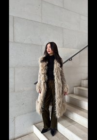 • Femme portant un long manteau beige avec bordure en fourrure, un top noir et un pantalon foncé, debout sur des escaliers en pierre claire à côté d'un mur avec une rampe métallique.
