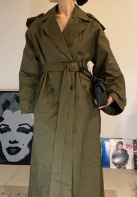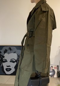 • Personne portant un trench-coat vert olive avec ceinture, tenant un sac à main noir, debout à l'intérieur près d'œuvres encadrées de Marilyn Monroe et Michael Jackson.