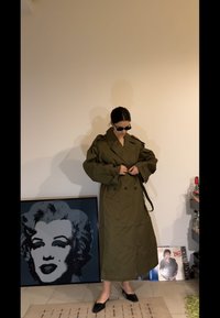 • Femme portant un trench-coat vert olive, des talons noirs, des lunettes de soleil et un petit sac à main noir, debout à l'intérieur près d'une œuvre emblématique de Marilyn Monroe et des disques vinyles.