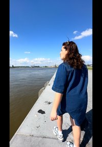 • Robe chemise en denim à manches courtes, avec des boutons à l'avant et des poches. Cheveux ondulés, portant des lunettes de soleil à verres jaunes, tenant un sac à cordon gris.